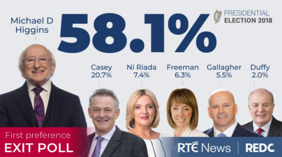 The exit poll results suggest that Michael D Higgins will be elected on the first count.
