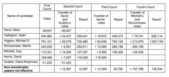 Here are the final results. Higgins 822,566 votes is the biggest number of first preference votes ever received in a presidential election.