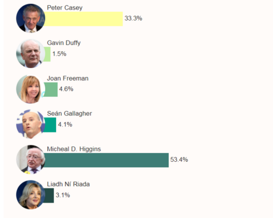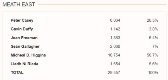 The Carlow-Kilkenny results are in – that’s a 52% result for Higgins and 28.2% for Casey. Ní Riada got 4.9%