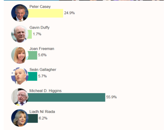 MICHAEL D HIGGINS HAS BEEN RE-ELECTED AS PRESIDENT OF IRELAND WITH 55.8% OF THE VOTE