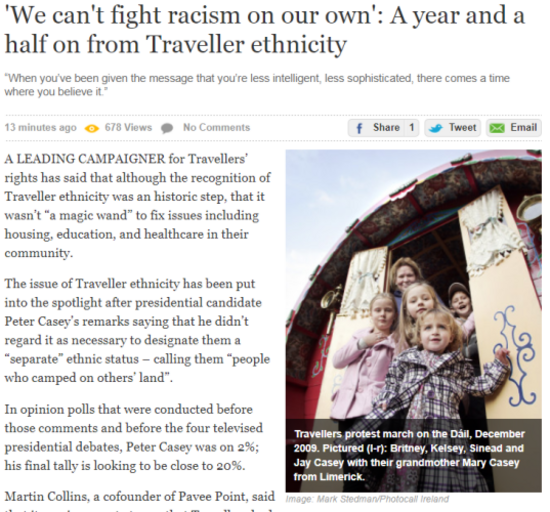 Kathleen Lawrence of Pavee Point has been speaking to Morning Ireland. She, not surprisingly, disagrees with Casey’s view on how he managed to move into second place.