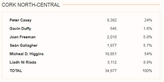 It’s from Dublin Bay North and shows Higgins’ result at above the national result and Casey’s below.