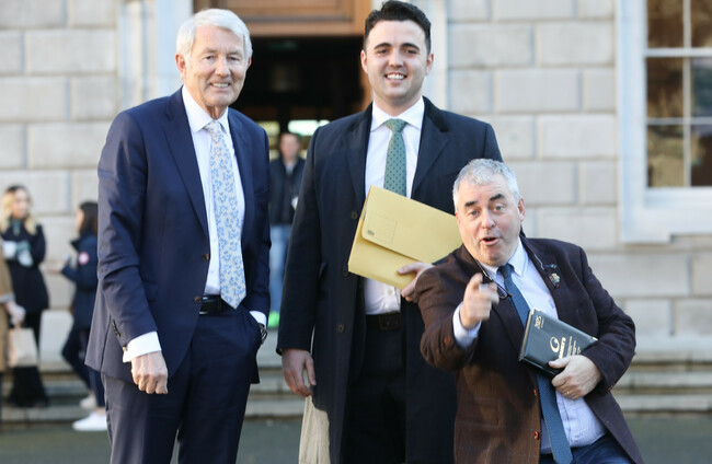Regional Independent TDs Michael Lowry, Barry Heneghan and Kevin 'Boxer' Moran on the plinth of the Dáil. RollingNews.ie