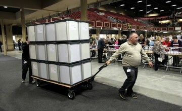 If you’ve ever wanted to know what hundreds of votes being transported around a count centre looks like, it’s your lucky day. Here’s electoral workers wheeling in votes at the City West Hotel earlier this morning: