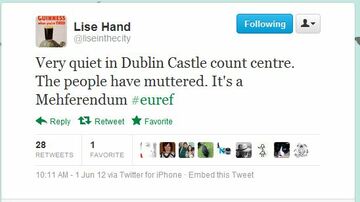 Minister for European Affairs Lucinda Creighton, who had been sitting solemnly across the studio, immediately burst out laughing (which Senator Byrne didn’t seem to appreciate). He tried to explain how people like Mattie McGrath had been pivotal in the Yes vote but Lucinda wasn’t buying it.