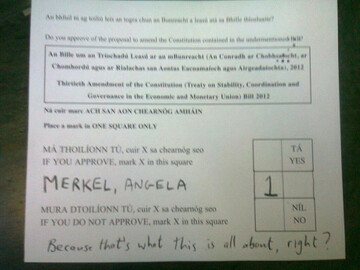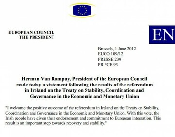 Enda Kenny says that following the ‘Yes’ win, he has spoken to Francois Hollande, Angela Merkel, Herman van Rompuy and Mariano Rajoy (PM of Spain).  We’d like to know what they said back.