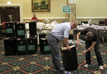 The first results are expected to start coming in shortly from the 26 count centres around the country. Here’s electoral workers opening a box at the City West Hotel in Dublin: