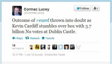 Dublin North West becomes the second Dublin constituency  to register a No vote after Dublin South West. Interestingly, both constituencies are home to government ministers: Pat Rabbitte and Junior Minister Brian Hayes are both DSW while Junior Minister Roisin Shortall is DNW.