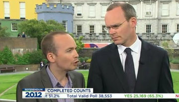 RTÉ’s Miriam O’Callaghan is asking him why the ‘Yes’ vote won. Adams reckons that people were scared by the Government and that people voted without enthusiasm because they felt beaten down by circumstances.