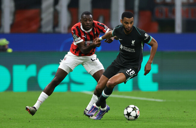 liverpools-cody-gakpo-front-is-challenged-by-ac-milans-youssouf-fofana-and-christian-pulisic-during-the-champions-league-opening-phase-soccer-match-between-ac-milan-and-liverpool-at-the-san-siro-s Cody Gakpo is brought down on the run. Alamy Stock Photo Alamy Stock Photo