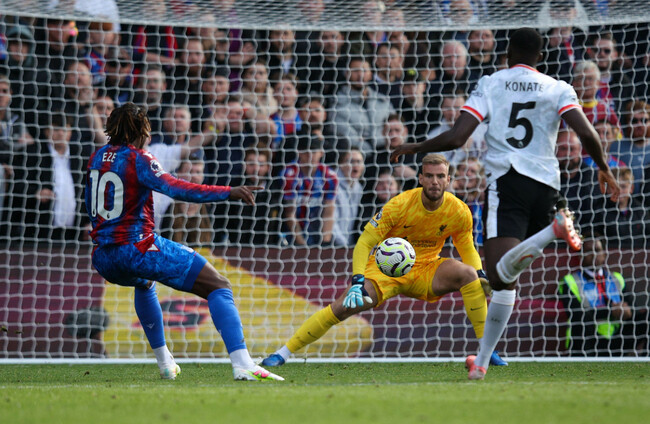 Eberechi Eze of Crystal Palace sees his shot saved by Vítězslav Jaroš of Liverpool, Alamy Stock Photo