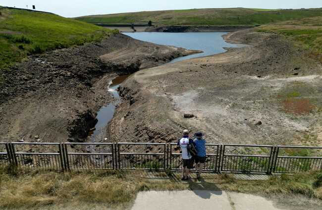 People look over a dry bank of a tributary to the Dowry Reservoir near Manchester PA