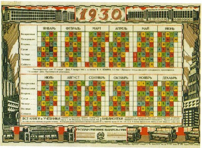To accommodate the all-too-frail human flesh required to operate that continuously-producing equipment, the Soviets created the five-colour-encoded calendar above.  Under this calendar, 20 per cent of the workforce had any given day off , depending, of course, on which colour they’d been assigned.