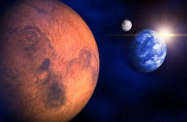 Mars, Earth and the Moon in space - 3d render via Shutterstock