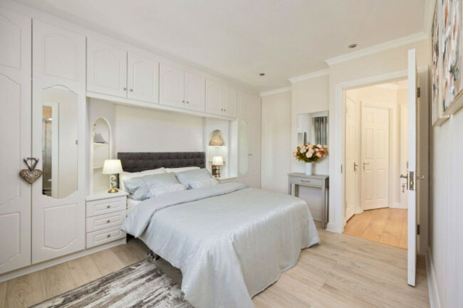 Upstairs, the space continues to impress. The main bedroom is a retreat, complete with custom fitted wardrobes, recessed lighting and a stylish en suite bathroom with a corner shower. Two more bedrooms are equally well-appointed, offering fitted storage, unique decorative touches such as wall panelling and mouldings and premium laminate flooring throughout.