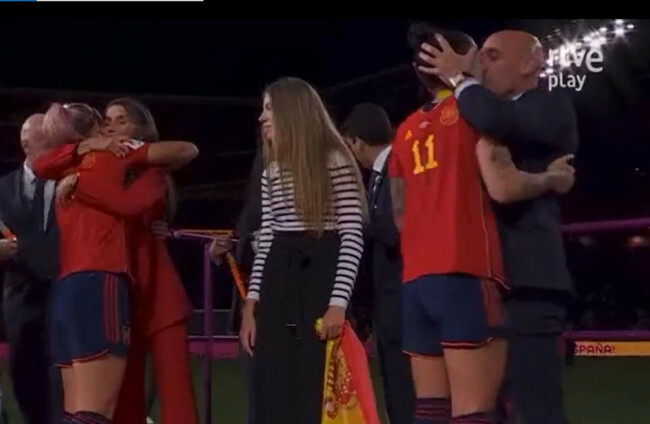 Footage has also emerged of Rubiales kissing goalscorer Olga Carmona, and of him celebrating Spain’s win in the stadium’s VIP area by grabbing his crotch.