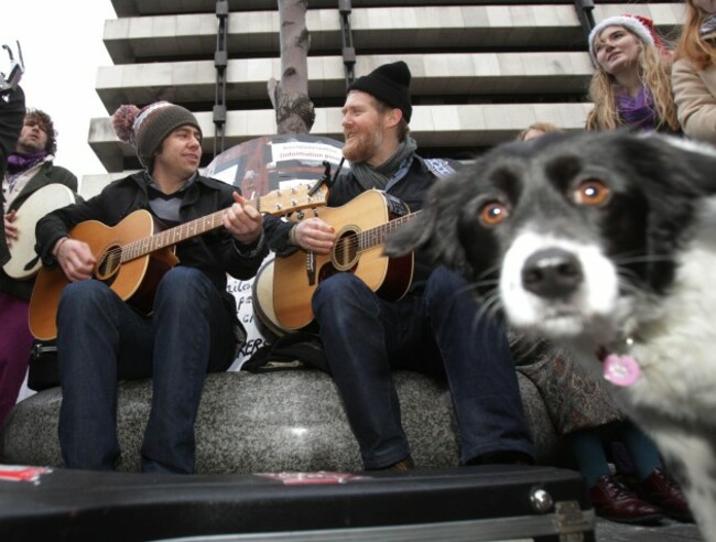 PA Archive ... Glen Hansard and a small dog get carried away with themselves outside the Central Bank. PA Archive ... Glen Hansard and a small dog get carried away with themselves outside the Central Bank.