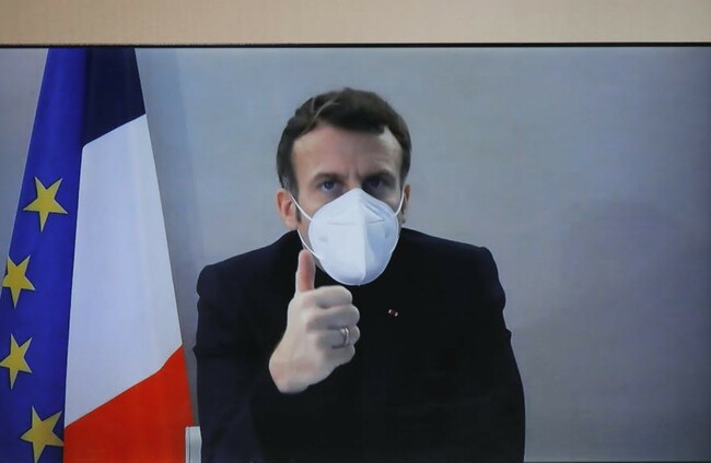 Video excerpts released by the EU showed the leaders spread out in a circle in a huge meeting room but Macron and most of the other leaders were not wearing masks.