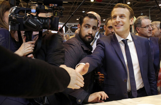 Emmanuel Macron, centre, flanked by his bodyguard, Alexandre Benalla, left. Christophe Ena