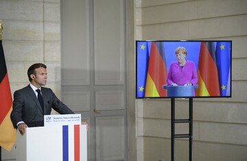In a sign of how the pandemic has changed global diplomacy, their joint press conference saw them stand at lecterns in cities hundreds of kilometres apart, with Merkel in Berlin and Macron in Paris.