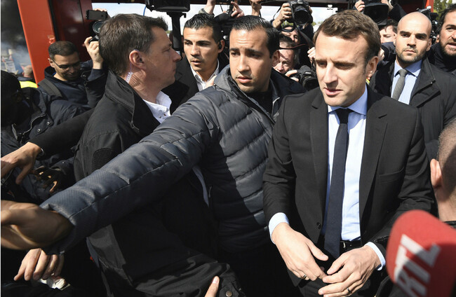 French centrist presidential election candidate Emmanuel Macron, flanked by his bodyguard, Alexandre Benalla. Eric Feferberg