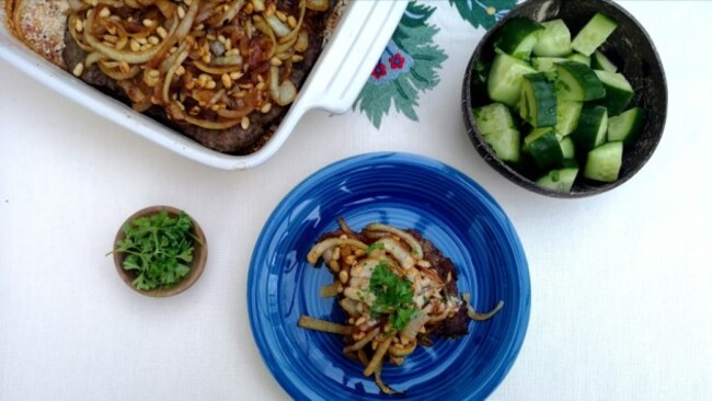 Take your kibbeh from the oven, it will probably have shrunk and come away from the edges as it cooked especially if you haven’t used bulgur. That’s OK. Just spoon the onion mixture on top and put it back in the oven for five minutes.