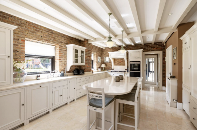 The expansive open plan kitchen, dining and family living area is the true heart of this home. Designed with both function and flair, it features a large central island, gas range cooker, exposed timber beams and beautiful brick accents that nod to the home’s Tudor heritage. The adjoining sunroom, bathed in natural light thanks to Velux windows and direct garden access, creates an easy connection between indoor and outdoor living.