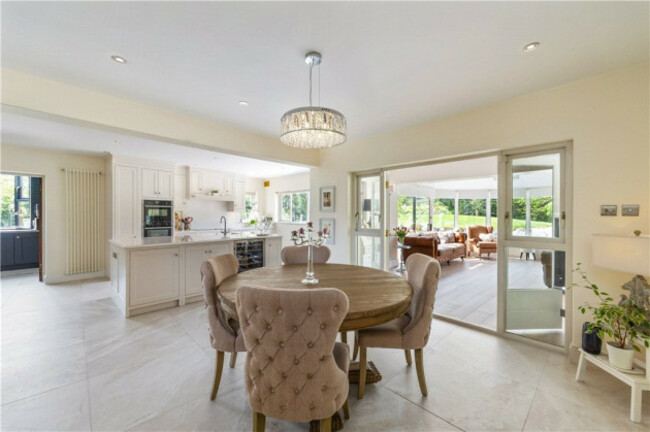 Upstairs, the home’s main living quarters are designed with effortless flow in mind. The open plan kitchen, living and breakfast room is undoubtedly the busiest place in this home. With a bespoke solid wood kitchen, marble-topped island and high-spec appliances from NEFF, Miele, Siemens and Samsung, this is a space built for entertaining.