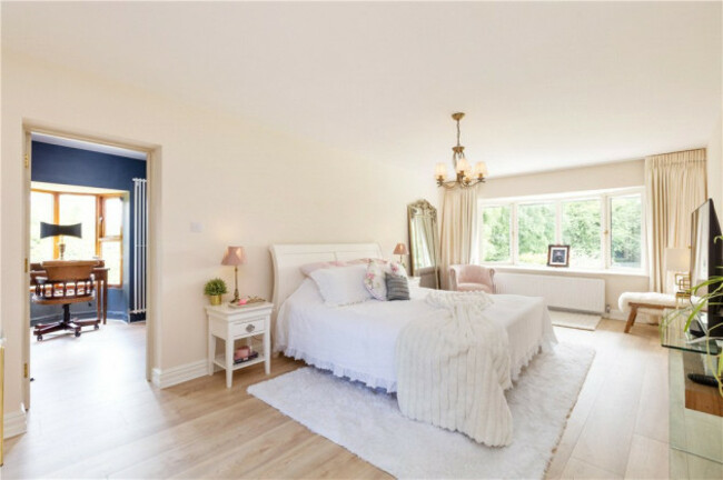Upstairs, all five double bedrooms enjoy a west-facing aspect, bathed in afternoon light. The main suite rivals any luxury hotel with its spacious en suite bathroom, twin basins, a walk-in wardrobe with a turret-style window and uninterrupted views of the grounds.
