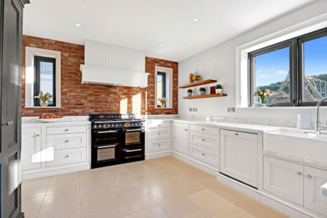 At the back lies the true focal point. The expansive kitchen and dining space was certainly designed for modern family living. Handcrafted by Joinery Joe McHugh, the kitchen combines bespoke cabinetry with high-end finishes, including a SMEG range cooker, Belfast sink and stone worktops. Exposed brick detailing adds warmth and texture, while full-height glazing and sliding doors connect the indoors effortlessly with the garden beyond.