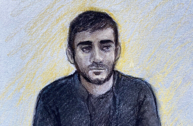 Court artist sketch from August, 2022, by Elizabeth Cook of Jaswant Singh Chail appearing via video link at Westminster Magistrates' Court, where he was charged under the Treason Act. PA
