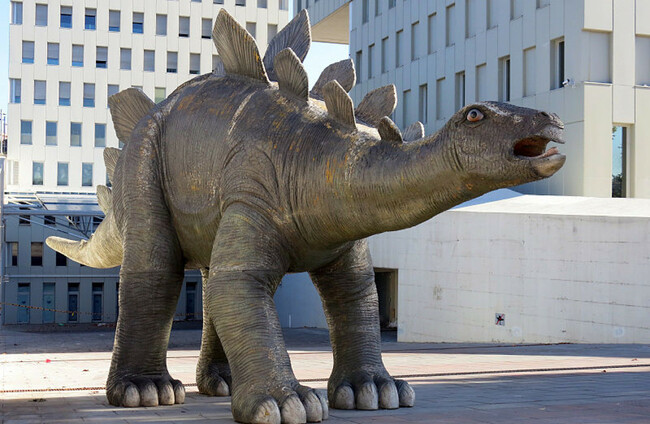 The decorative stegosaurus is located outside a disused cinema in Santa Coloma de Gramenet. Wikimedia Commons