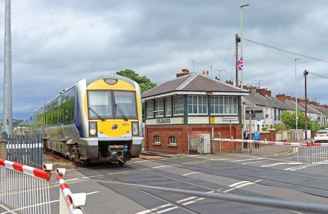 File image of a train passing a level crossing at Bushmills Road, Coleraine. A man was found in the area with arms bound overnight. Alamy Stock Photo