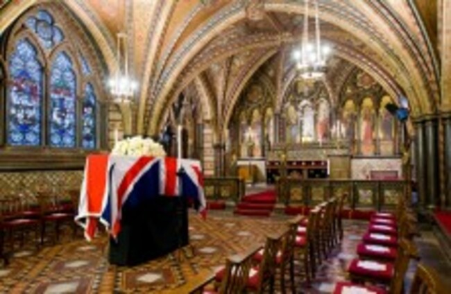 Margaret Thatcher's coffin rests in the Crypt Chapel of St Mary Undercroft beneath the Houses of Parliament in central London overnight. Leon Neal/PA Wire