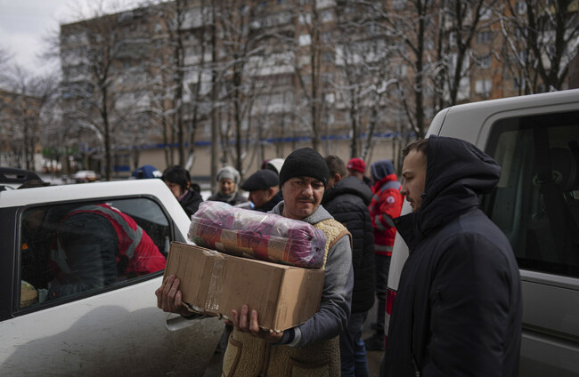 russia-ukraine-war People gather to receive humanitarian aid in Mariupol. Evgeniy Maloletka Evgeniy Maloletka