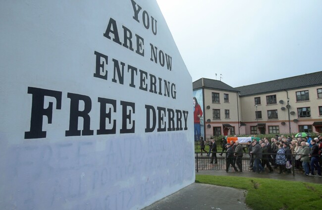 The coffin of Martin McGuinness is carried past Free Derry corner in his home city. PA Wire/PA Images
