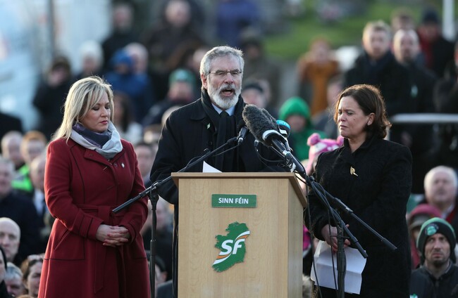 Gerry Adams delivers the graveside oration for Martin McGuinness flanked by Sinn Féin leader in the north Michelle O'Neill and Mary Lou McDonald.