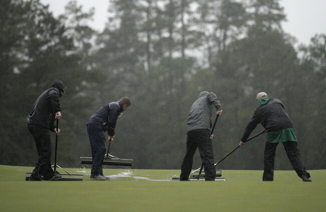Greenskeepers clear water away from the 18th green at Augusta National. Alamy Stock Photo