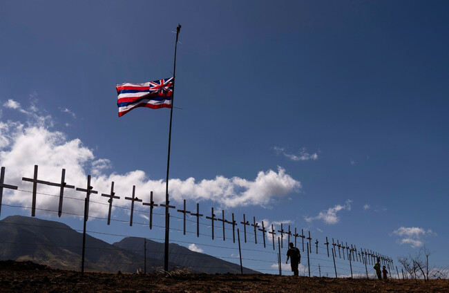 Crosses honouring the victims killed in the wildfire hang on a fence along the Lahaina Bypass. Jae C. Hong, AP