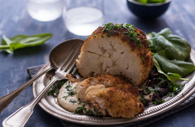 Remove the foil, baste with the cooking juices, and bake for another 15 minutes uncovered, until the cauliflower is cooked through and golden. Serve with roast baby potatoes, roast red onions from the pan and greens.