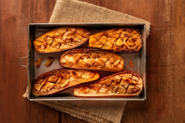 Make a marinade by mixing together 1 tbsp miso paste, soy sauce, grated ginger, crushed garlic and a dash of sesame oil until it forms a thin paste. Cut the aubergine in half lengthways, and spread the paste all over the flesh. Bake for 25-30 minutes until the aubergine is cooked through, then serve with a selection of roast vegetables, using the cooking juices from the aubergine as a gravy.