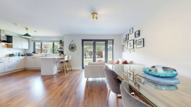 The spacious layout includes a welcoming entrance hall, living room, open plan kitchen, dining and family area, utility room and guest toilet on the ground floor. Upstairs features four bedrooms, including a guest with en suite bathroom and family bathroom, while the top floor hosts a large primary suite with en suite bathroom and extra storage. High-quality finishes, bespoke cabinetry, integrated appliances, and energy-efficient heating add to the appeal. Conveniently located near schools, public transport, the coast, golf club and major roads.