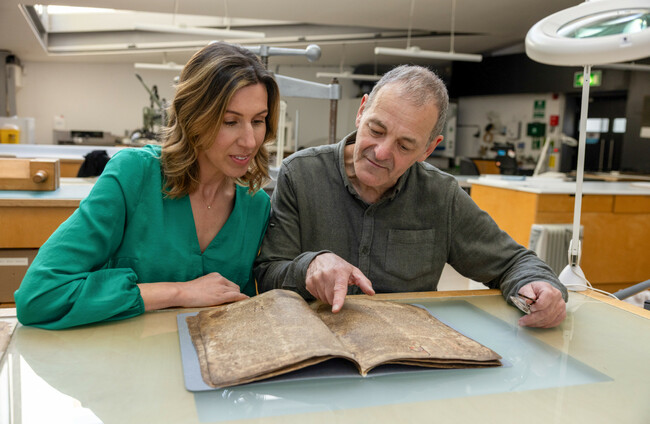 Conservator Dr John Gillis and Curator Caoimhe Ní Ghormáin with The Book of Leinster Paul Sharp SHARPPIX