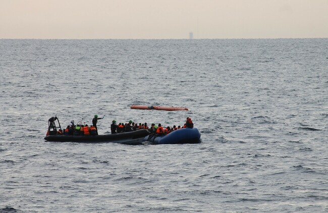 The crew of the LÉ Samuel Beckett assisted in the rescue and transfer of 140 migrants from a rubber vessel to the MS Aquarius, during a search and rescue operation conducted 23 nautical miles northwest of Tripoli.