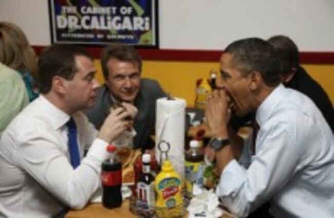 File photo of Medvedev and Obama enjoying burgers together in Virginia, US last year. AP Photo/Mikhail Klimentyev/ PA Images