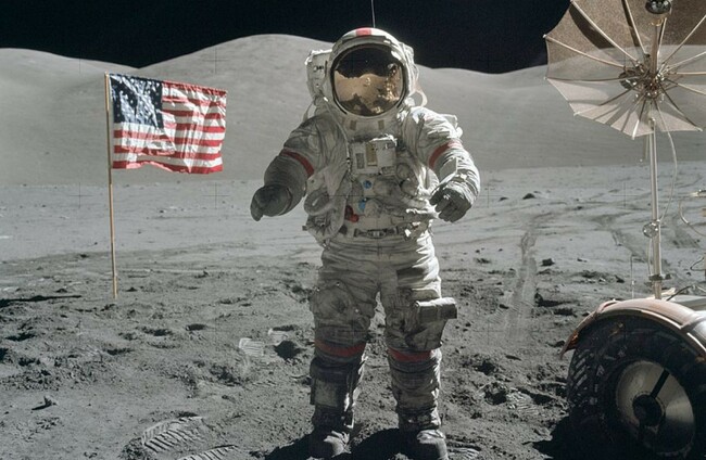 Cernan at the beginning of EVA 3 on the moon. NASA/Harrison H. Schmitt via Public Domain