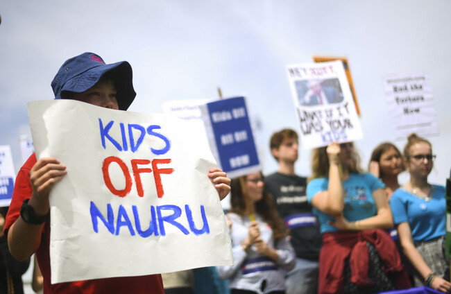 Protesters hold up signs during a rally demanding the resettlement of kids held on Nauru outside Parliament House in Canberra, Australia. AAP/PA Images