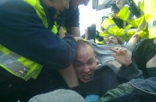 Approaching the truck and seeing that gardaí intended to remove the man using a cherry picker, the group sat down on the road in front of the truck to prevent garda access to the vehicle.