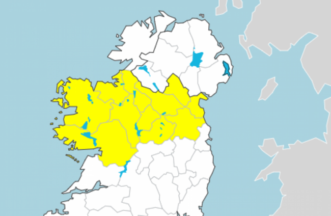 The weather warning is in place from today at 9pm until tomorrow at 9pm for the following counties: Galway, Mayo, Roscommon, Sligo, Leitrim, Longford, Louth, Westmeath, Meath, Cavan and Monaghan.