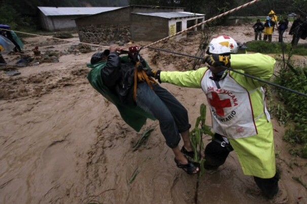 A rescue worker uses a zip-line to cross a civilian through an overflowed river in the town of Santa Maria de Tlahuitoltepec, Mexico, Tuesday Sept. 28, 2010. A mudslide first thought to have buried hundreds of people has left 11 missing and there are no confirmed dead, authorities said, backing off earlier predictions of a catastrophe in Mexico's rain-soaked southern state of Oaxaca. (AP Photo/Luis Alberto Cruz Hernandez)